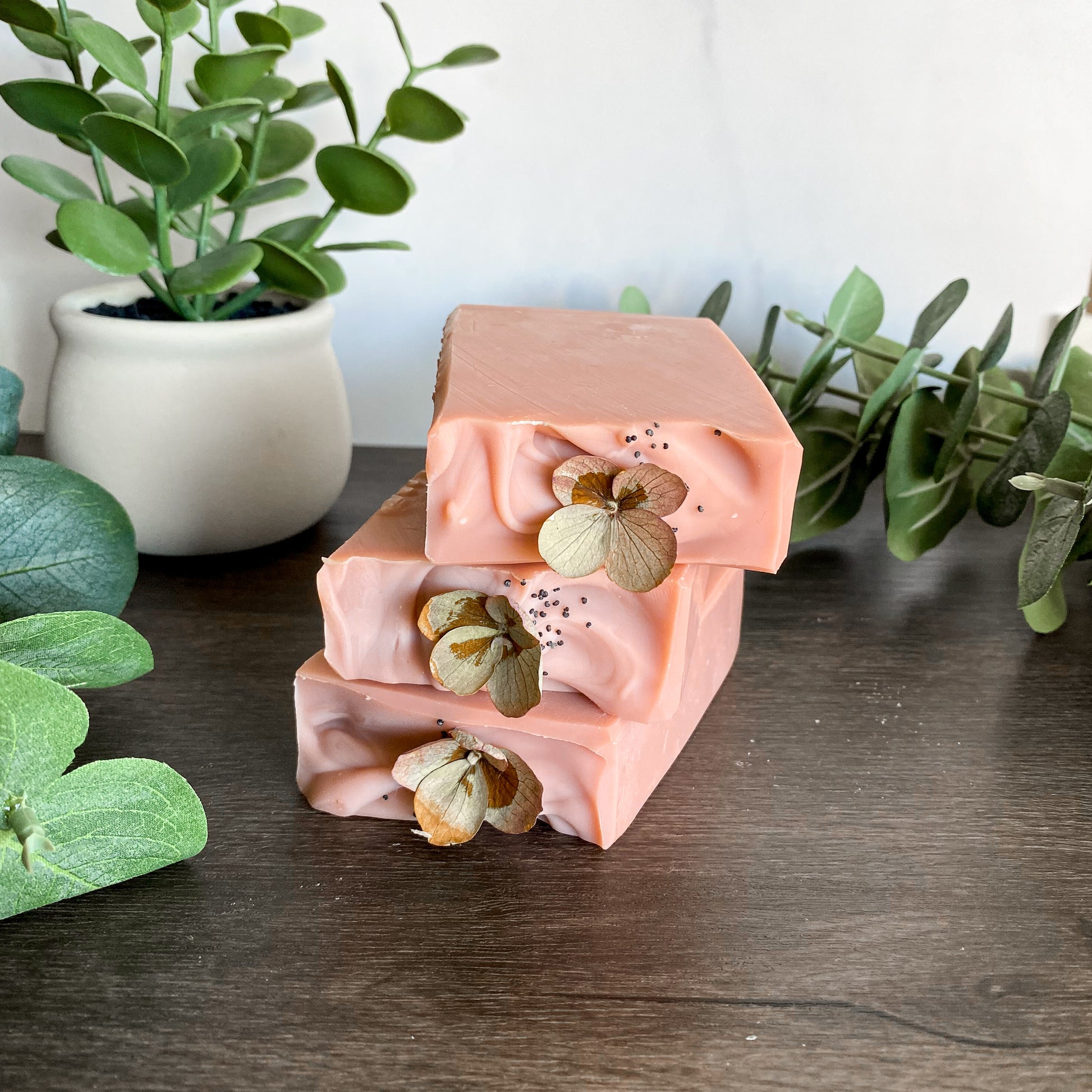Olive Oil, Coconut Oil, Shea Butter, Castor Oil, Hemp Seed Oil, Sodium Hydroxide, Distilled Water, Essential Oil Blend, Rose Clay, Poppy Seeds.