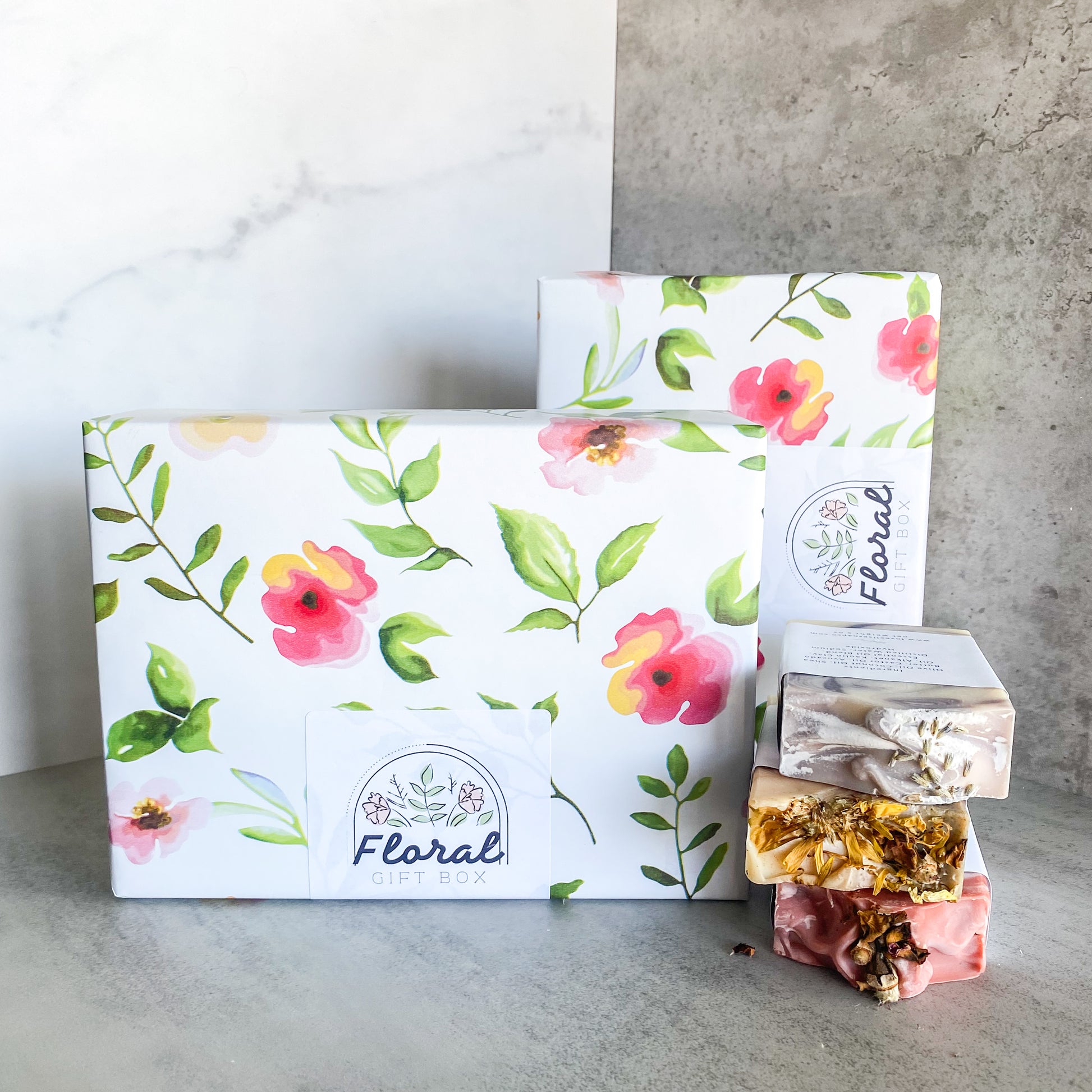 Floral Gift Box has 3 beautiful flower bar soaps. Lavender Fields, Elizabeth's Garden and Rose Petal. This pretty floral set is perfect for the flower lover wrapped in a floral wrapping paper. For special occasions, birthday's, Mother's Day, or just thinking you!